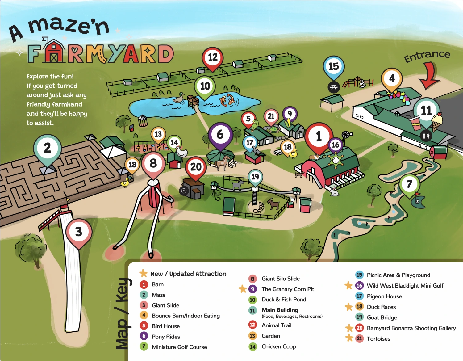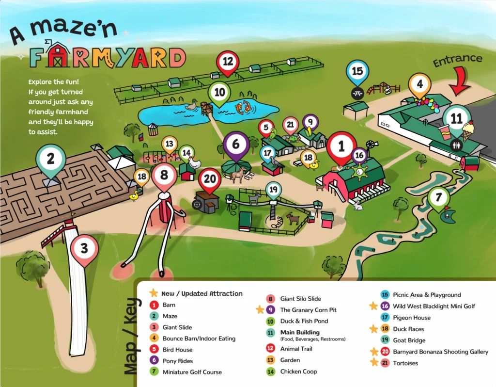 Get ready for an unforgettable experience at A Maze’n Farmyard LLC! Whether you’re planning your day around the incredible 150-foot long slide, petting zoo, or mini-golf course, this map will guide you to every exciting corner. Don’t miss the jumping pillow or the one-of-a-kind barnyard maze.