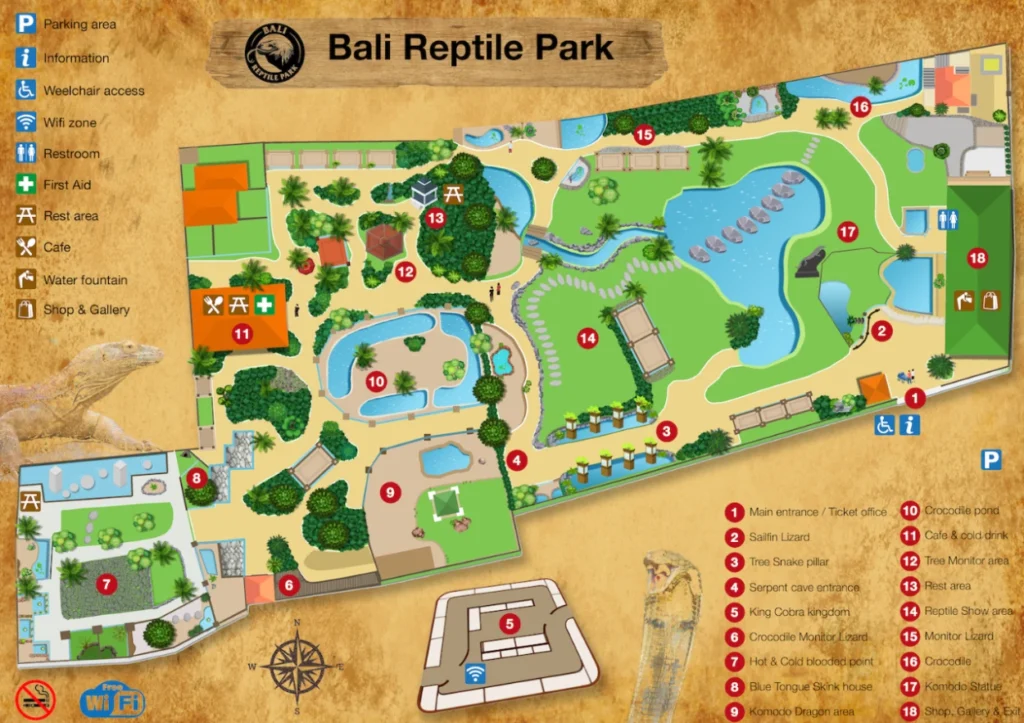 The most up-to-date Bali Reptile Park Map is here to guide you to all the park’s must-see spots. From the lush Komodo Dragon enclosure to the thrilling Python Pathway, this map covers every attraction.