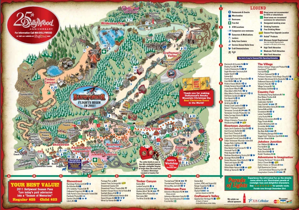 Dollywood climbs and curves through Smoky Mountain hillsides, so a Dollywood map is less about north and south and more about “up there” and “down yonder.” The park folds into wooded slopes where coasters dive under walking paths and country kitchens hide behind souvenir porches. Steam whistles from the train echo across Craftsman’s Valley, and that narrow bridge near Rivertown Junction clogs fast when the parade rolls out.