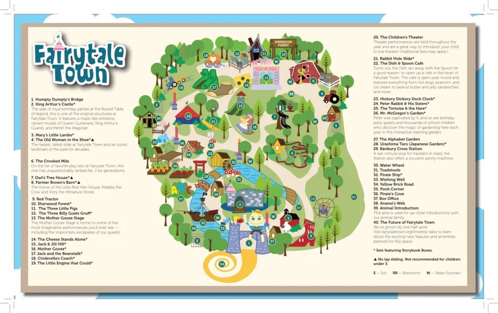 Fairytale Town’s storybook layout winds through 25 themed play sets circling a shady central lawn—small enough to roam freely, yet easy to lose your bearings near Humpty Dumpty’s bridge or the crooked house paths. A Fairytale Town map keeps parents and kids synced between the animal pens, snack stands, and puppet stages without retracing steps.
