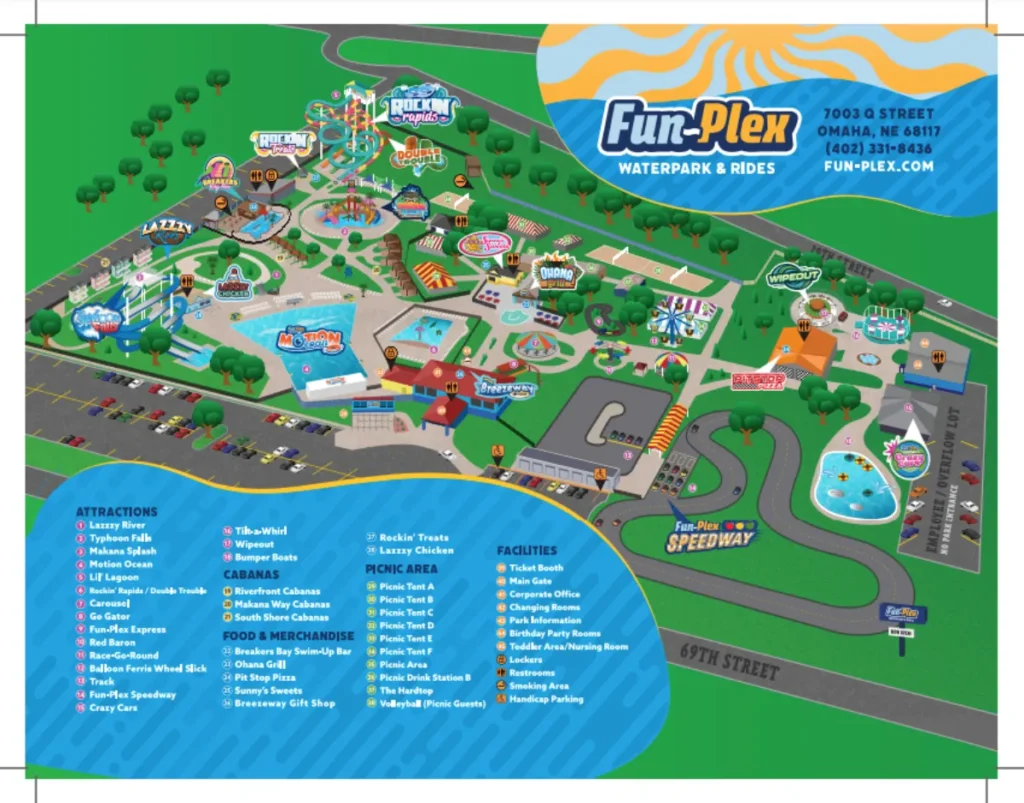 Fun-Plex is Nebraska’s largest amusement and water park located in Omaha. It features roller coasters, go-karts, mini golf, a wave pool, water slides, and a lazy river. The park operates seasonally and combines traditional carnival-style rides with water attractions, offering entertainment for both kids and adults.