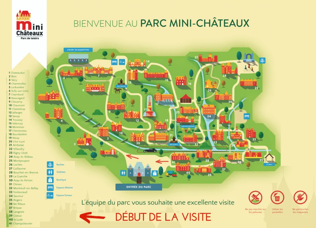 The Mini Castle Park Map 2025 features a detailed layout of 41 miniature castles, each numbered and listed for easy identification, along with pathways, gardens, and themed play areas. Key visitor services such as restrooms, first aid, picnic spots, ticketing, boutique, and mini-golf are clearly marked with icons for convenience. The map helps guests efficiently navigate the park and locate all attractions and amenities.