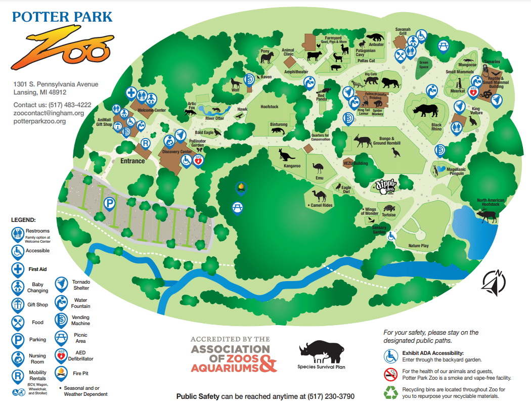 Potter Park Zoo is accredited by the Association of Zoos and Aquariums (AZA). Accreditation confirms that the zoo meets high standards of animal care, conservation, education, and research. AZA accreditation is reviewed every five years, ensuring continued compliance with professional zoological practices.