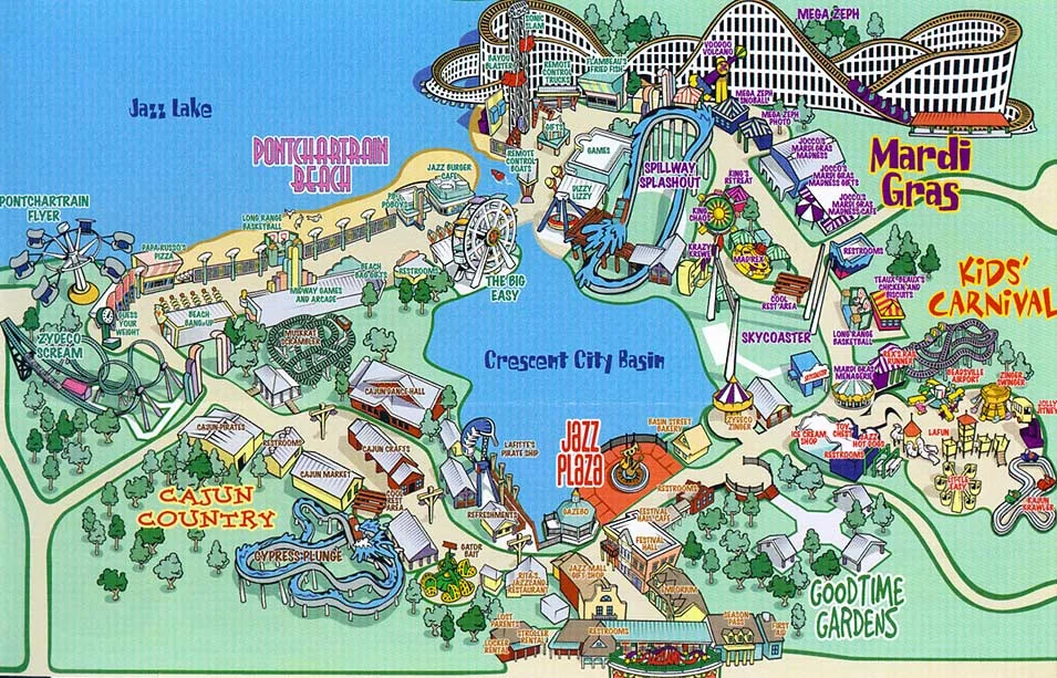 Built on the edge of a bayou and boxed in by levees, Six Flags New Orleans was a park that always felt half-wild, half-urban. A Six Flags New Orleans map once helped you trace wooden coaster tracks skimming swamp grass, find the flood-prone midway that turned into a maze after rain, and spot the small train loop that connected everything before the heat took over.