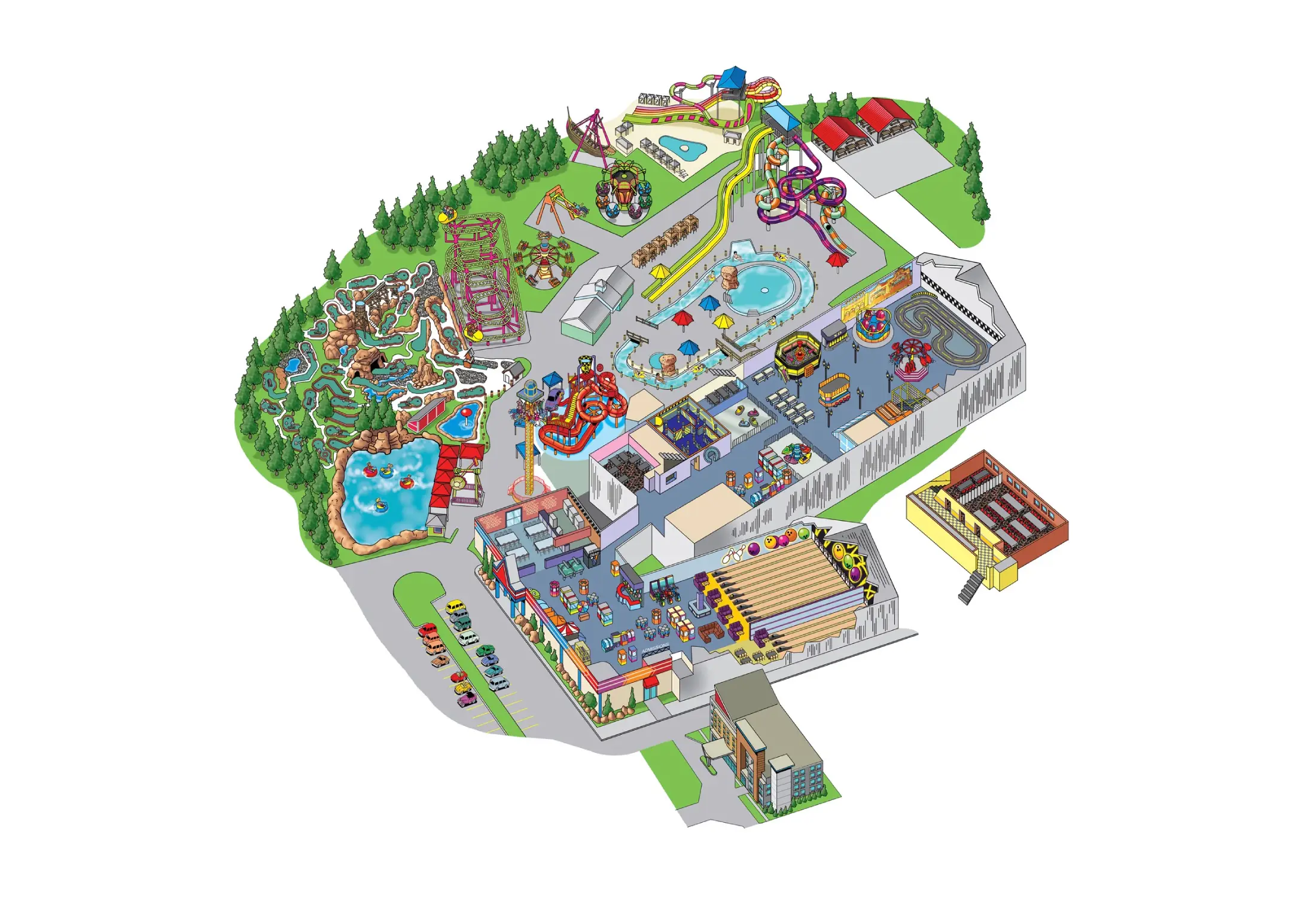 Built around a compact indoor-outdoor footprint, The Funplex packs coasters, arcades, and water rides into a single looping layout that can feel like a maze on summer weekends. A The Funplex map keeps visitors oriented between the indoor attractions, the Splashplex slides outside, and the midway’s food stands and games.